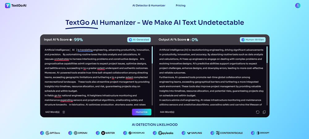 TextGo takes and removes all the elements that enable AI detection tools to spot AI patterns, like watermarks and generic linguistic characteristics. Afterward, it rewrites the original text in a tone and format that resembles what was written by a human. The content won’t have any generic or robotic tone that triggers detection.